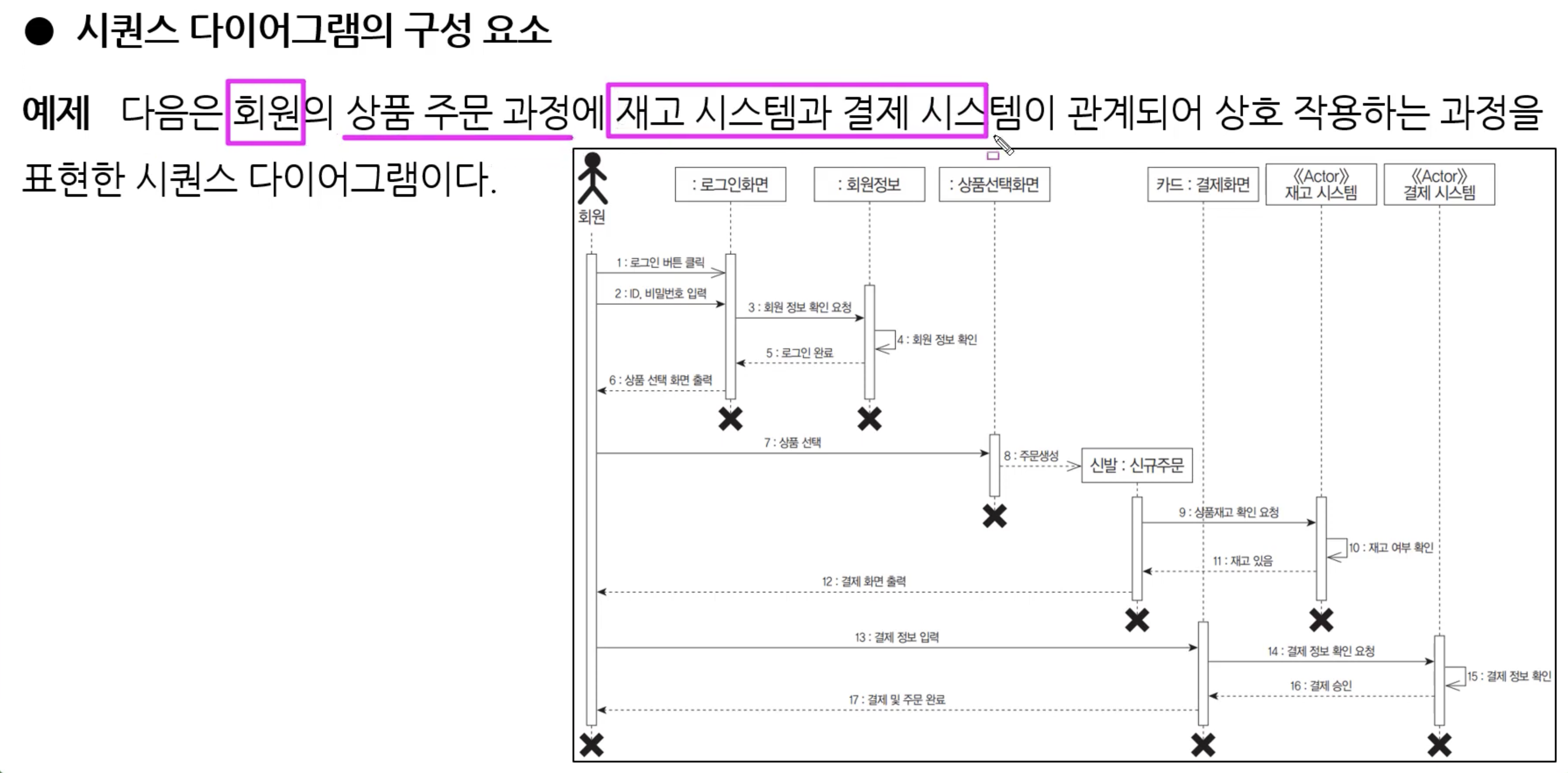 시퀀스 다이어그램의 예시를 보면 위와 같습니다. 회원이라는 액터 오른쪽으로 객체들이 있습니다. 로그인 화면은 로그인이 완료되면 소멸되는 표식이 되어 있는 것을 볼 수 있고, 로그인 화면이라는 객체는 X를 만날 때까지 실행상태인 것을 활성 상자를 통해 알아볼 수 있습니다.