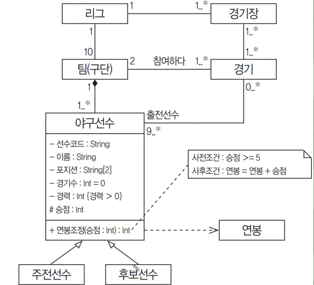 예를들어 위와 같은 것이 대표적인 정적 모델링 - 구조 다이어그램 - 클래스 다이어그램입니다. 위의 그림을 하나씩 살펴보겠습니다. 야구선수 클래스만 클래스명, 속성, 메서드가 표현되어 있습니다. 리그와 팀의 관계를 보면 리그는 한 개가 있고, 팀은 10개가 있는 것을 볼 수 있습니다. 리그와 경기장의 관계를 보면, 리그는 한 개 이상의 경기장에서 경기가 진행된다는 것을 알 수 있습니다. 팀과 경기의 관계를 보면 팀은 2개개 경기는 한 번 이상의 경기를 진행한다는 것을 알 수 있습니다. 팀과 야구선수의 관계를 보면 팀은 한 개이고, 야구선수에는 1명 이상이라는 것을 알 수 있습니다. 주전선수와 후보선수는 일반화관계로 야구선수와 연결되어 있는 것을 볼 수 있습니다. 또한 야구선수 내부에 { } 중괄호로 묶여 있는 부분이 있는 것을 확인할 수 있는데요. 클래스의 제약조건을 직접 기술할 때 중괄호로 표현할 수 있습니다. 또한 연봉조정이라는 메서드에는 제약조건이 따로 걸려 있는 것을 확인할 수 있습니다. 위의 그림에서 클래스 다이어그램을 완벽하게 표현한 것은 야구선수 밖에 없고 나머지는 생략한 것을 볼 수 있습니다. 이렇게 작성된 것들을 클래스 다이어그램이라고 하며, 작성된 클래스 다이어그램을 보고 코드를 작성할 수 있게 됩니다. 이렇듯, 클래스 다이어그램은 개발자 입장에서 작성하는 것입니다.