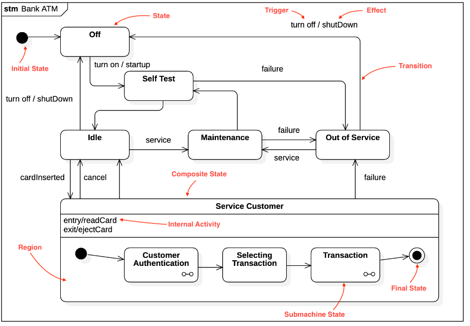 상태 다이어그램 State Diagram: 하나의 객체가 자신이 속한 클래스의 상태 변화 혹은 다른 객체와의 상호 작용에 따라 상태가 어떻게 변화하는지를 표현합니다. 럼바우(Rumbaugh) 객체지향 분석 기법에서 동적 모델링에 활용됩니다.