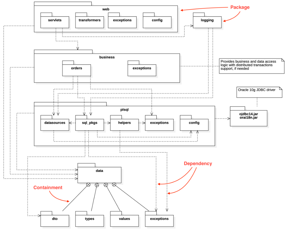 패키지 다이어그램 Package Diagram: 유스케이스나 클래스 등의 모델 요소들을 그룹화한 패키지들의 관계를 표현합니다.