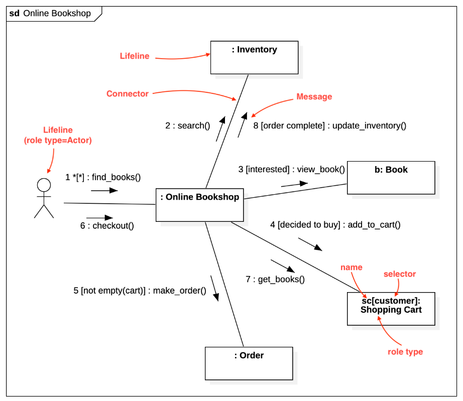 커뮤니케이션 다이어그램 Communication Diagram: 동작에 참여하는 객체들이 주고받는 메시지와 객체들간의 연관 관계를 표현합니다.