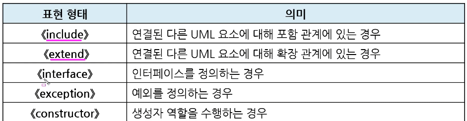 스테레오 타입은 UML 에서 표현하는 기본 기능 외에 추가적인 기능을 표현하는 것입니다. 길러멧 (Guilemet) 이라고 부르는 겹화살괄호 << >> 사이에 표현할 형태를 기술합니다.