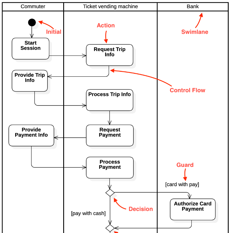 활동 다이어그램 Activity Diagram: 시스템이 어떤 기능을 수행하는지 객체의 처리 로직이나 조건에 따른 처리의 흐름을 순서에 따라 표현합니다.