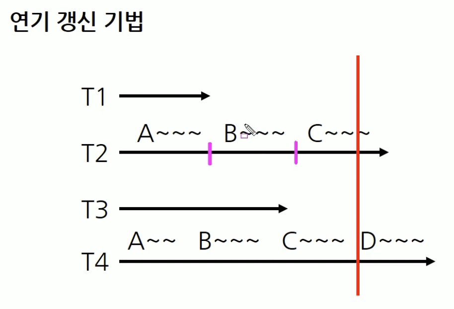 연기 갱신 기법은 로그에만 기록이 남지, 데이터베이스에는 반영이 되지 않습니다. T1 과 T3 는 연산이 끝났기 때문에 REDO를 수행하면 된다. T2 와 T4 는 트랜잭션이 끝나지 않았기 때문에 따로 처리를 해줄 필요가 없이 그냥 무시해도 문제가 없습니다.