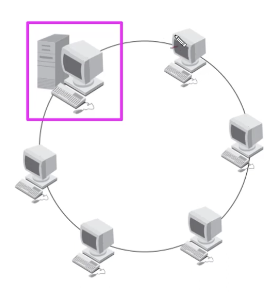 링형은 컴퓨터와 단말장치들을 서로 이웃하는 것끼리 연결시킨 Point-to-Point 방식의 구성 형태입니다. 단말장치의 추가 / 제거 및 기밀 보호가 어려운 특징이 있으며, 각 단말장치에서 전송 지연이 발생할 수 있습니다. 이러한 특징 때문에 중계기의 수가 많아지며, 데이터는 단방향 또는 양방향으로 전송할 수 있습니다.