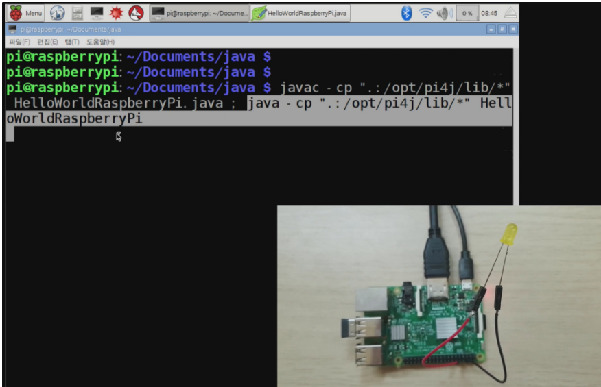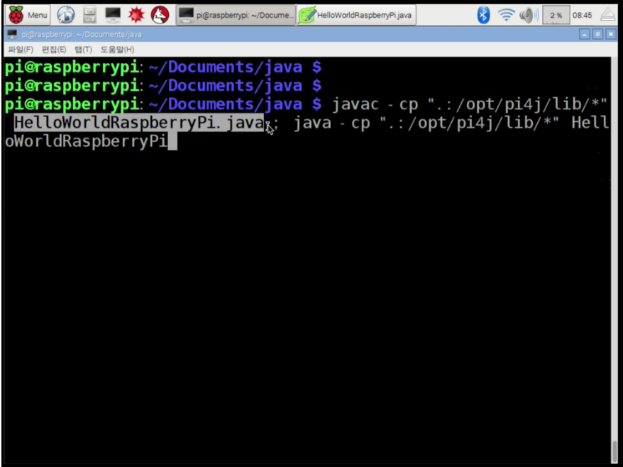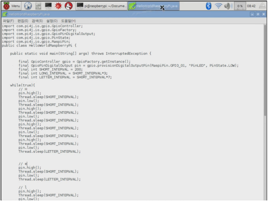 저는 여기서 HelloWorldRasberryPi.java라는 파일을 만들고 다음과 같은 내용의 java 프로그램을 작성했습니다.