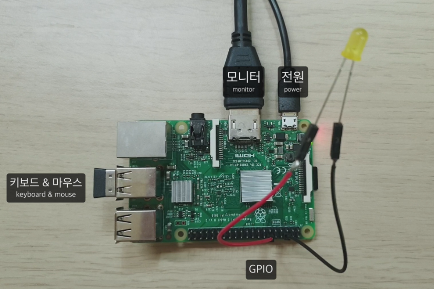 단순히 불을 켜는 것이 아니라, Hello를 모스부호로 표현해볼 겁니다. 지금 라즈베리 컴퓨터에 다음과 같이 주변기기를 연결했습니다. 다음은 제가 지금 보고있는 라즈베리 컴퓨터 화면입니다.