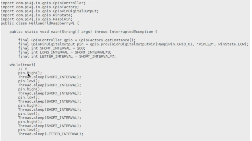 여기에 작성된 java는 우리가 아직 배우지 않았기 때문에 모르지만 한국말은 서로 이해할 수 있잖아요. 설명을 들어보시죠. 여기 가운데 보시면 pin이라는 문구가 보입니다. GPIO에 해당하는 pin의 특정한 부분에 전기가 흐르게 됩니다. 그러면 전기가 켜지게 됩니다. 그리고 아래에 SHORT_INTERVAL이 있는데 우리가 위에서 200이라고 지정해두었습니다. 즉, 0.2초만큼 불이 켜지게 되는 겁니다. 0.2초가 지난 다음에 다음이 실행되는데 전기가 끊기게 됩니다. 불이 켜졌다 꺼졌다를 반복하면서 모스부호의 H라는 텍스트를 표현하는 겁니다. 이런 방식으로 모스기호를 LED로 표현할 수 있게 되는 겁니다. 그러면 제가 짠 이 코드를 실행할 건데, eclipse를 통하지 않고 java를 직접 실행시켜 볼겁니다.