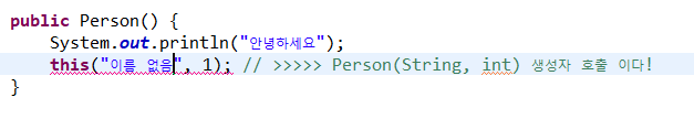 this("이름 없음", 1); // 아래에 있는 다른 생성자인 Person(String, int) 생성자 호출!
