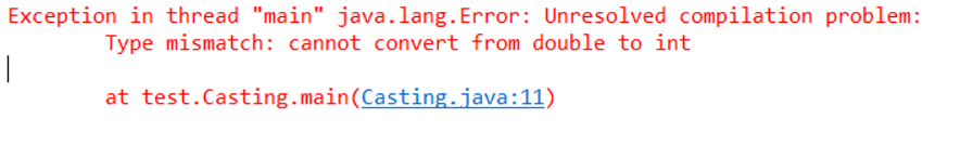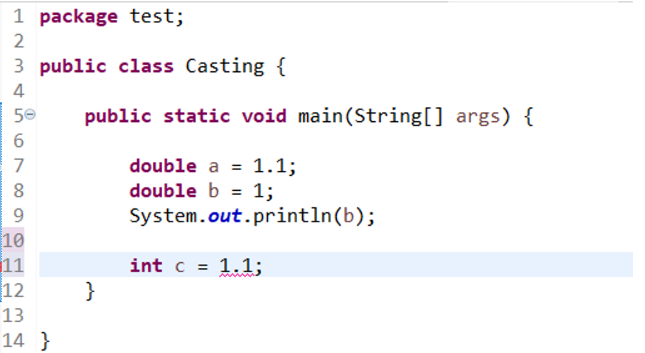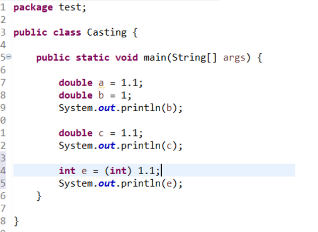 eclipse가 제공하는 첫 번째 항목인 Add cast to ‘int’도 알아봅시다. 이것이 무슨 뜻이냐면 1.1은 double이잖아요. 저것을 int형태로 강제로 바꾸어 주겠다는 것을 의미합니다. 이 항목을 클릭하면 코드가 다음과 같이 바뀌게 됩니다.