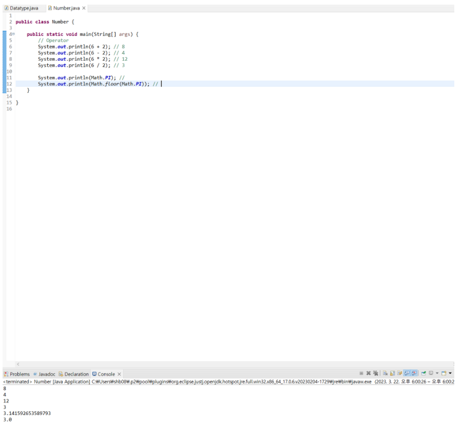 Math.PI, Math.floor(Math.PI), Math.ceil(Math.PI) 이렇게 간편하게 pi와 pi의 내림한 숫자를 아주 편리하게 확인할 수 있습니다. 숫자 관련된 기본적인 연산자들과 명령들을 알게 되면 Java를 통해서 다양한 수학적인 작업을 처리할 수 있습니다. 계산기만으로는 상상도 할 수 없는 복잡한 수학적인 작업들을 우리는 Java로 해결할 수 있습니다.