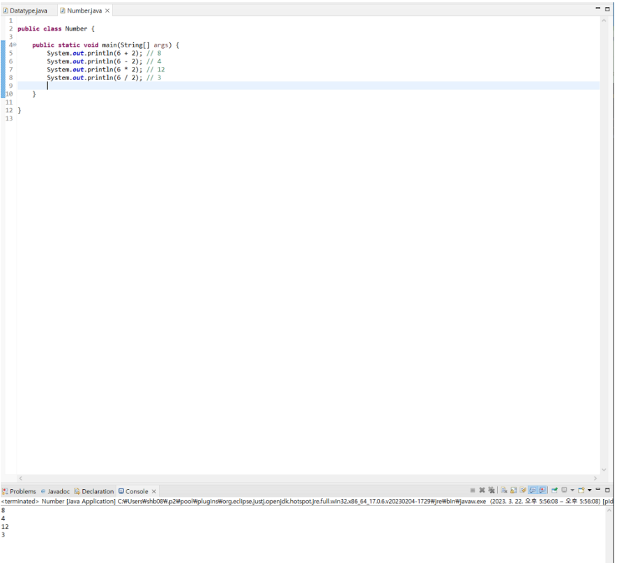이렇게 4칙연산도 아주 간단하게 할 수 있는 것을 확인할 수 있습니다. +, -, *, /를 한국어로는 연산자라고 하고 영어로는 operator라고 합니다. Java에는 수많은 기능들이 있습니다. 그래서 이 중에 내가 필요한 기능들을 단위별로 가져가서 사용할 수 있는데, 수학과 관련한 도구들은 Math 라는 캐비넷 안에 들어가 있습니다. Math하고 . 을 찍어보면 다양한 도구들이 나오는 것을 확인할 수 있습니다. eclipse를 사용하면 이런 편리한 기능들을 제공해줍니다.