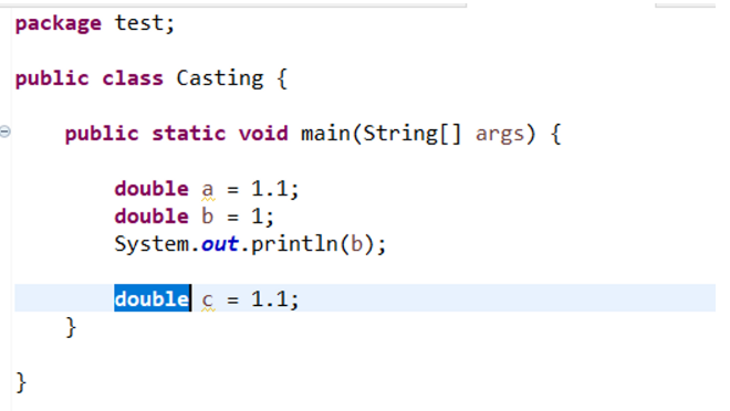 먼저 Casting이라는 이름의 클래스를 만들겠습니다. 그런 다음 위와 같은 코드를 작성했습니다. 여기서 1.1이라는 숫자는 어떤 데이터 타입인가요? 실수입니다. 정확하게는 double 데이터 타입입니다. 그럼 이 값을 변수에 담으려면 a라는 이름의 변수의 데이터 타입이 double이어야 합니다. 그런데 1은 뭔가요? 데이터 타입이 double인가요? 소수점이 없기 때문에 정수입니다. 정확하게는 int입니다. 그런데 정수 값은 double 변수 b에 담으려고 했을 때는 에러가 나지 않습니다. 그리고 나서 화면에 b의 값을 출력해 보면 1.0이 출력됩니다. 즉, 1이라는 정수가 변수 b에 담길 때 변수 b가 double 타입이기 때문에 자동으로 1이 double 타입으로, 다시 말해 실수 1.0으로 변환(casting, 캐스팅) 됩니다. 이처럼 값이 변환되면 잃어버리는 값이 있을 수 있습니다. 여기서 잃어버린다는 말의 의미는 곧 알게 됩니다. 그럼 비슷하지만 다른 사례를 한번 보겠습니다. 1.1은 double 타입입니다. 그런데 이 값을 정수형 변수 c에 담으려고 하면 에러가 발생합니다.