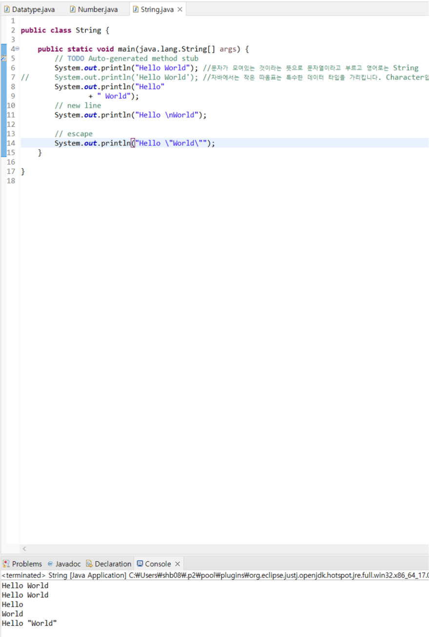 전에 배웠던 방법으로 class를 바로 생성해봅시다. 다른 언어를 하시다가 Java를 하시는 분들이 헷갈리시는 것이 하나 있습니다. 바로 작은 따옴표인데요. Java에서 작은 따옴표는 특별한 데이터 타입으로 character입니다. 단어 한개를 의미합니다. 주의해야 합니다. 그리고 문자열에서 줄바꿈을 하기 위해서는 엔터를 해서는 작동하지 않습니다. \n 역슬래시 n 이라는 특수한 기호를 붙이면 됩니다. \n 은 new line의 약자입니다. 또한 문자열에서 “ 큰 따옴표를 그대로 쓰기 위해서는 \” 역슬래쉬를 붙여주면 됩니다. 이렇게 역슬래쉬를 활용해서 뒤에 따라오는 문자의 역할을 바꾸어주는 것을 해방시켜준다는 뜻에서 escape라고 합니다.
