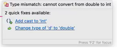 여기서 “Type mismatch: cannot convert from double to int”라는 에러 메시지의 의미는 double 타입의 값을 int 타입의 변수 c에 담으려고 하면 안된다는 뜻입니다. 왜냐하면 double 타입은 보다시피 소수점이 있고, 정수는 소수점이 없기 때문에 두 값의 타입을 자동으로 바꾸면 소수점 이하의 0.1을 잃어버리는 현상이 생길 수 있기 때문입니다. 자, 그럼 이 문제를 해결하는 방법으로 어떤 것이 있는지 알려드리겠습니다.