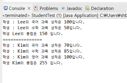 - 2 명의 학생을 만들고 두 학생의 과목 성적과 총점을 각각 출력해 봅시다.