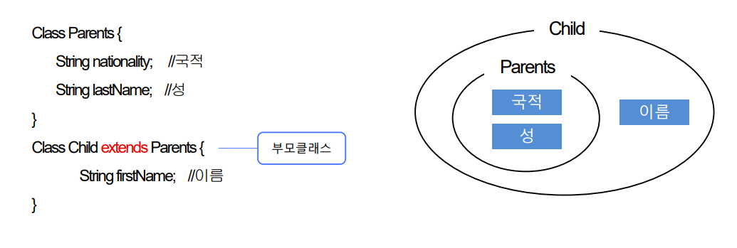 - 자바 문법으로 상속을 구현할 때는 extends 예약어를 사용합니다.