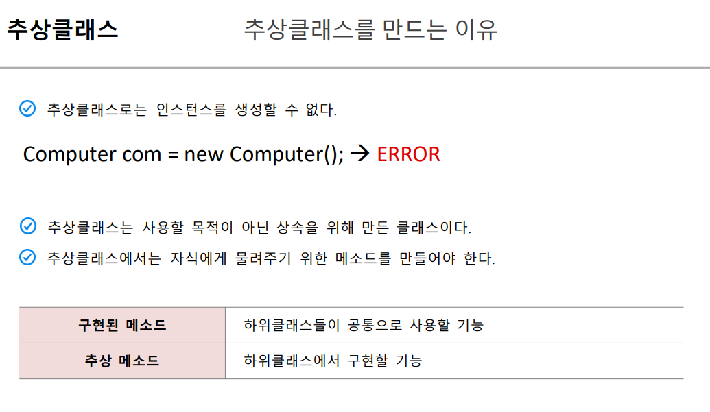 - 따라서 이런 문제를 예방하기 위해 추상 클래스는 인스턴스를 생성할 수 없도록 되어있습니다.