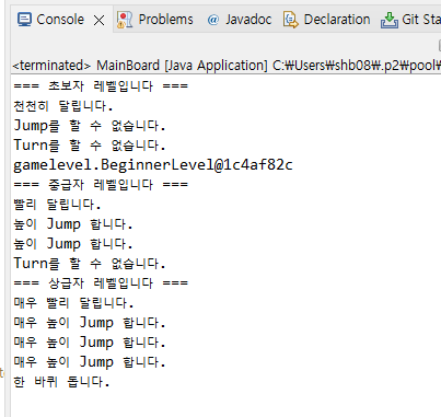 - 각 레벨마다 run( ), jump( ), turn( ), showLevelMessage( ) 메서드는 조금씩 다르게 구현되기 때문에 추상 메서드로 선언합니다.