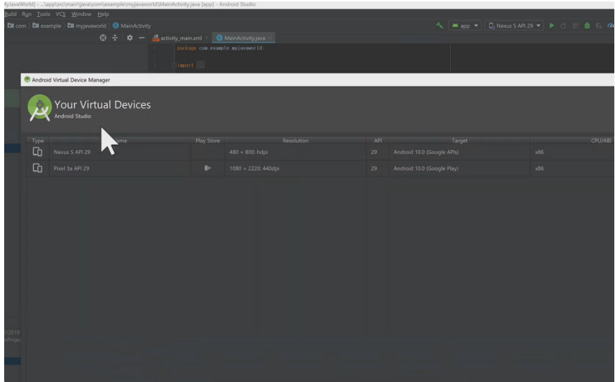 상단 Tools - AVD(android Virtual Device)라는 것으로 여기서 가상으로 java를 실행할 수 있습니다. 자 그럼 우리가 만든 java world라는 앱을 실행해 볼까요?