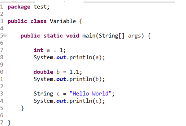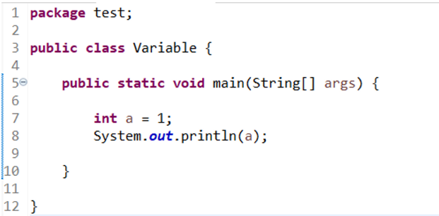 이번 시간에는 정말 중요하고 쓸모가 많은 기능인 ‘변수’를 살펴보겠습니다. Java Class를 하나 만들고, Name에는 변수를 뜻하는 ‘Variable’을 입력하고, main 체크박스를 체크한 다음 Finish 버튼을 클릭합니다. 수학에서는 문자를 변수라고 합니다. 다음과 같이 말이죠. a = 1; 그런데, 자바에서는 이렇게 변수를 설정하면 오류가 납니다. 왜냐하면 변수를 만들 때 변수에 들어갈 데이터타입을 정해줘야하기 때문입니다. 우리가 1을 전에는 Number라고 했는데요. a는 지금 정확하게는 integer라고 정의할 겁니다. integer는 정수를 의미합니다. 여러분 자연수 Number는 1, 2, 3, … 에 해당하는 숫자들입니다. 반면에 정수는 -3, -2, -1, 0, 1, 2, 3, … 인 정수입니다. 그래서 여러분이 앞에 integer를 의미하는 int를 붙이면 변수가 성공적으로 작동하게 됩니다. int a = 1; 이렇게 말이죠.
