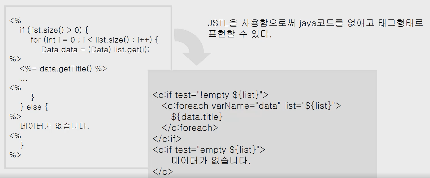 수업목표 프런트 개발자가 JSP를 수정하는데, JSP 안에 자바코드와 HTML 코드가 섞여 있다면 수정할 때 굉장히 어려움을 느끼게 될 가능성이 큽니다. 이런 문제를 해결하기 위해서 등장한 것이 JSTL (JSP Standard Tag Library) 입니다. JSTL 을 이용하면 태그형식으로 조건문, 반복문 등을 사용할 수 있습니다. 그리고 앞에서 배운 EL 과 연동하면 더욱 강력하게 사용 가능합니다. 이번 시간에는 이러한 JSTL 에 대해서 알아보도록 하겠습니다. JSTL (JSP Standard Tag Library) 란 ? JSTL 은 JSP 페이지에서 조건문 처리, 반복문 처리 등을 html tag 형태로 작성할 수 있게 도와줍니다. 왜 멀쩡한 자바 코드를 JSTL 로 바꾸는 작업을 하는 것일까..