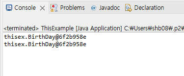 앞서 객체란 무엇이고, 코드로 객체를 어떻게 구현하고 생성하는지 알아보았습니다. 이제, 클래스와 객체에 관련된 새로운 용어들을 살펴보고, 객체 간에 어떻게 협력할 수 있는지 알아보겠습니다. 자신의 메모리를 가리키는 this this 는 간단히 설명하면 생성된 인스턴스 스스로를 가리키는 예약어입니다. 이 외에도 다른 역할로 this 를 사용할 수 있습니다. 예제를 통해 하나씩 내용을 살펴보겠습니다. package thisex; class BirthDay { int day; int month; int year; public void setYear(int year) { this.year = year; } public void printThis( ) { System.out.println(this); } } pu..
