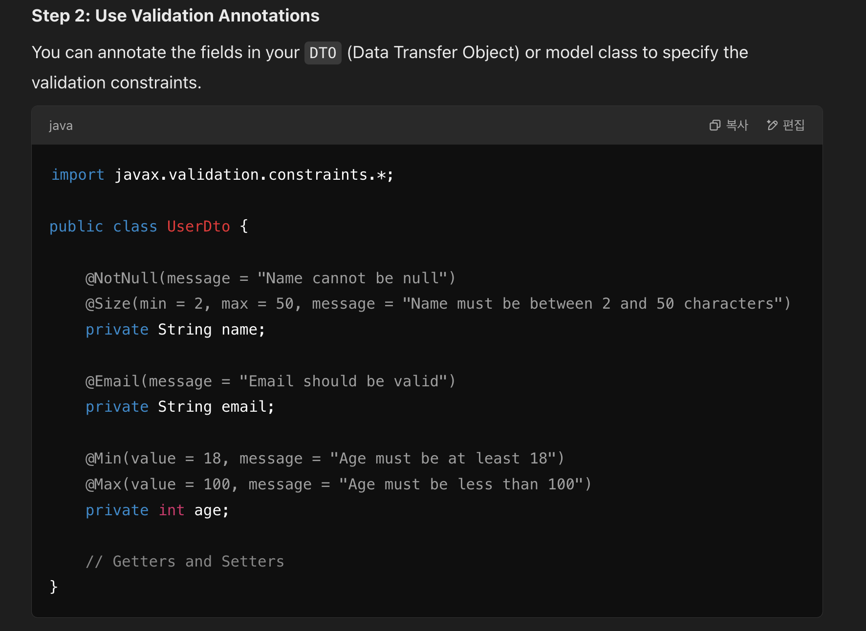 Validation Annotations DTO 와 같은 클래스의 필드에는 위와 같이 어노테이션으로 규칙을 정해놓을 수 있다. 그리고 컨트롤러 단에서, 해당 dto 에 대한 @Valid 를 달아주면 DTO 내부에 설정한 것을 토대로 validation 이 진행된다. validation 이 실패하면 Spring 은 javax.validation.ConstraintViolationException.class 를 throw 해준다. 그리고 이것을 GlobalExceptionHandler 에서 처리해주면 된다. Custom Error Format 을 이용하고 싶다면 다음과 같이 해주면 된다. 복잡한 Validation 이 필요한 경우
