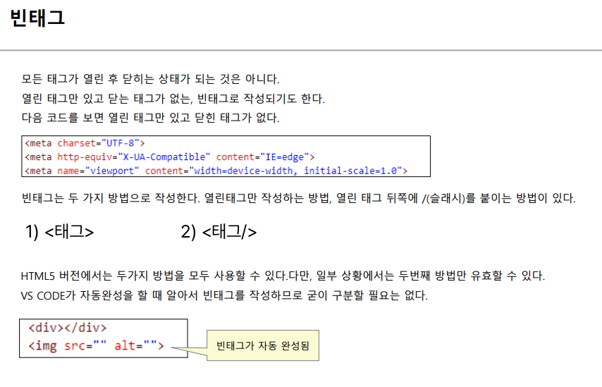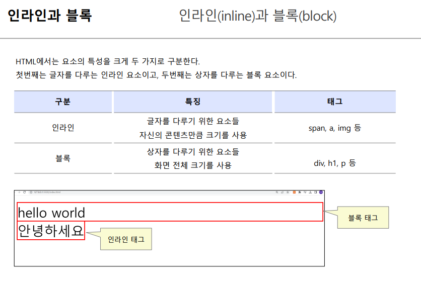 인라인 태그는 자신의 콘텐츠만큼 크기를 사용한다 블록 태그는 화면 전체 가로 크기를 사용한다. 인라인 요소는 가로 전체를 차지하지 않기 때문에 인라인 요소들 끼리는 같은 동일선상에서 놓이게 된다. 인라인 요소의 가장 큰 특징이라고 볼 수 있는 것은 바로 '크기를 지정할 수 없다'라는 점이다. 인라인 요소에는 좌우에만 여백(margin)을 지정할 수 있는 특성이 있다. 블록 요소는 생성이 되면 너비는 최대로 늘어나고 높이는 포함한 콘텐츠 크기만큼 늘어난다. 블록 요소의 가장 큰 특징은 인라인 요소와 다르게 너비 / 높이를 원하는 크기로 지정할 수 있다는 점이다. 또한 블록 요소는 여백도 상하좌우 상관없이 자유롭게 지정해줄 수 있다.
