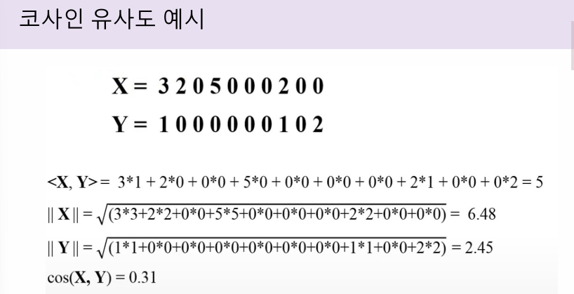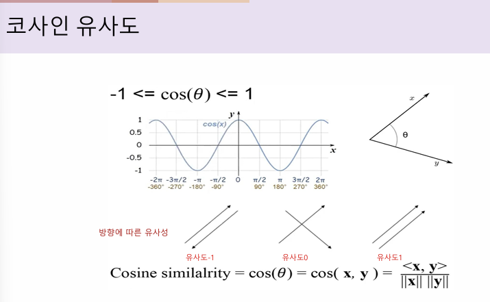 유사도를 검색하는 방법은 굉장히 다양합니다. 두 개의 각도가 0도로 일치할 수록 유사도가 크다고 판단할 수 있습니다.