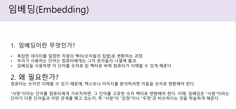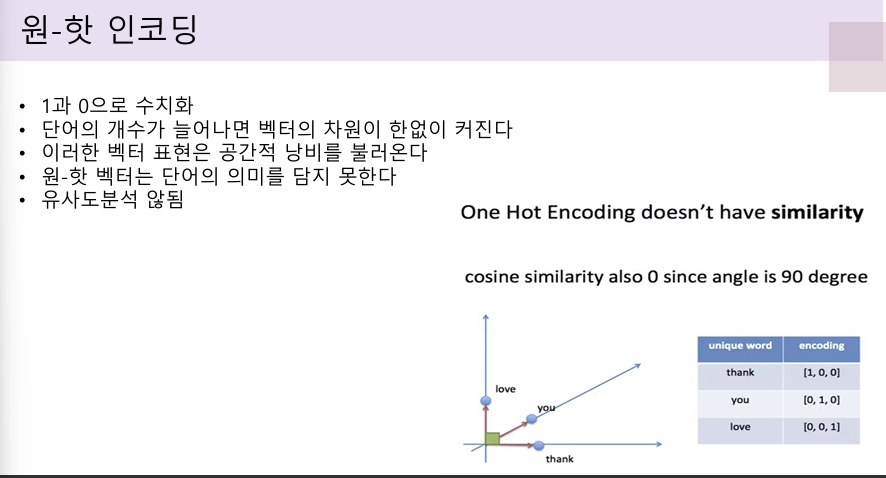임베딩이란 복잡한 데이터들을 'N차원'의 데이터로 변환시키는 것입니다. 기본적으로 컴퓨터는 숫자만 이해할 수 있기 때문에 숫자로 변환이 필요한데요. 컴퓨터가 활용하기 편하도록 저장한다고 이해 하시면 되겠습니다.첫 번째 원 핫 인코딩인데요. 지금 보면 각도가 45도씩 나누어져 있기 때문에 각 단어의 유사도를 확인할 수가 없습니다. 이런 이유로 차원의 개수를 비약적으로 늘려나가게 됩니다.