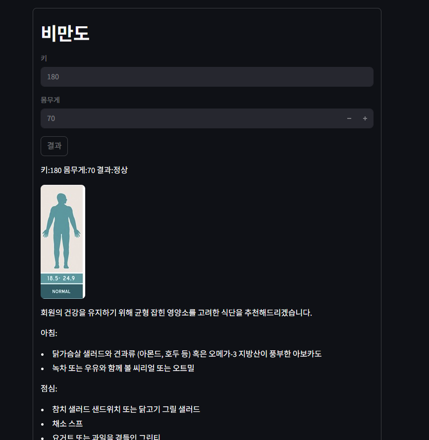 {'role':'user','content': f'지금 회원 정보를 알려줄게. 키 {height} 몸무게 {weight} 비만도는 {s}야. 이 사람의 건강 유지를 위해 아침, 점심, 저녁 식단을 추천해줘'}] )