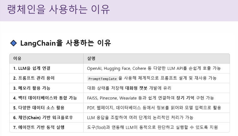LLM 모델에 상관 없도록 일정한 인터페이스로 이용할 수 있게 해주는 것이 가장 큰 장점입니다.