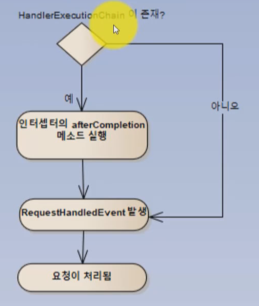 HandlerExecutionChain 이 존재한다면 인터셉터의 afterCompletion 메소드를 실행하게 됩니다. 그 이후에 RequestHandledEvent 가 발생됩니다. HandlerExecutionChain 이 존재하지 않았다면 바로 RequestHandlerEvent가 발생됩니다. 그리고 최종적으로 요청이 처리됩니다. Spring 을 더 공부하다보면 특정 이벤트가 발생했을 때 별도의 동작을 할 수 있도록 처리할 수 있다는 것 정도만 알아두시면 좋을 것 같습니다.
