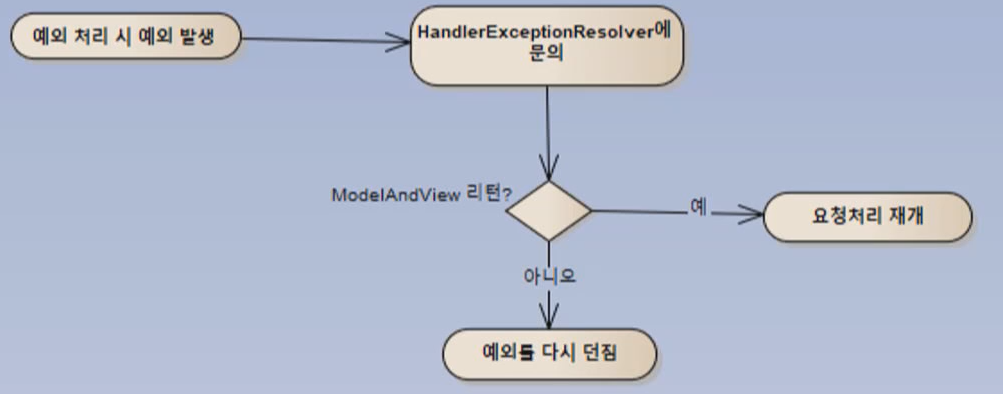 예외가 발생하면 HandlerExceptionResolver 에게 문의를 한 다음에 ModelAndView 가 있다면 요청처리를 재개하고 없다면 예외를 다시 던지게 됩니다.