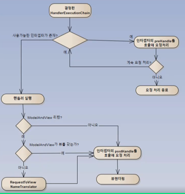 요청 처리에 대해서 살펴보도록 하겠습니다. HandlerExecutionChain 이 결정이되었다면 가능한 인터셉터가 존재하는지 파악하는데요.(인터셉터는 파트5에서 배우는데요. 일종의 필터입니다. 처리하기 전에 거쳐서 지나가게 하는 것입니다.) 사용가능한 인터셉터가 존재한다면 인터셉터의 preHandle 를 호출해서 요청을 처리합니다. 인터셉터가 존재하지 않는다면 핸들러가 실행된 이후에 리턴하는 결과가 ModelAndView 객체이고 ModelAndView 객체가 뷰를 갖고 있지 않다면 RequestToViewNameTranslator 가 동작을 하게 되구요. 그 이외에는 인터셉터의 postHandle를 호출해서 요청을 처리합니다. 마지막으로 뷰렌더링이 진행되어 결과를 보여주게 됩니다.
