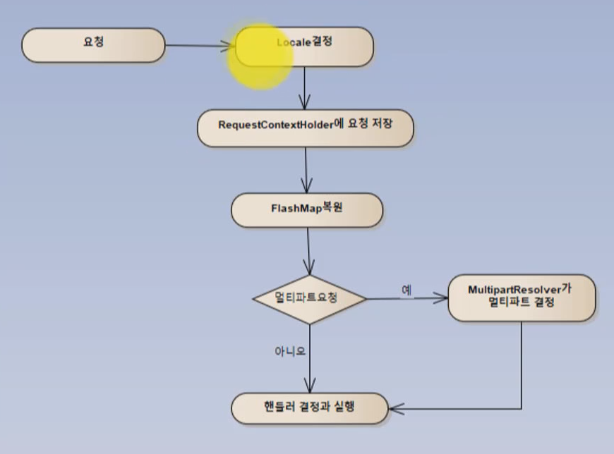 DispatcherServlet 은 위와 같은 요청 선처리 작업을 수행합니다. Spring MVC 는 '지역화'라는 것을 지원합니다. '지역화'라는 것은 같은 사이트에 접속을 했더라도 어떤 사용자에게는 한글로 된 페이지가, 어떤 사용자에게는 영어로 된 페이지가 노출되는 것을 처리할 수 있는 기능인데요. 이 처리는 각 사용자 웹 브라우저의 언어 세팅을 파악해서 받아오는데요. 브라우저가 보내오는 Header 정보에서 언어 설정 정보를 찾아서 Locale 을 결정을 하게 됩니다. 그리고 나면 이 정보를 가지고 Locale 에 설정한 값에 따라서 각각 다른 언어로된 화면을 보여주게 하는 것을 '지역화'라고 합니다. 이런 부분들을 선처리 하는 것이죠.
