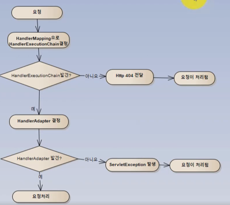 요청 전달을 살펴보겠습니다. 요청이 들어오면 HandlerMapping 으로 HandlerExecutionChain 이 결정이 됩니다. HandlerExecutionChain 이 발견이 된 여부에 따라서 처리가 달라집니다. 발견을 못했으면 페이지가 없는 것을 의미하고 이때는 클라이언트에게 Http 404 를 전달하고 요청이 처리됩니다. HandlerExecutionChain 이 발견이 되었다면 실제로 실행을 시키는 HandlerAdapter 가 결정이 됩니다. 그 다음에는 다시 HandlerAdapter 가 발견이 되는 여부에 따라서 실행이 바뀌게 되는데요. HandlerAdapter 가 발견이 안되었다면 이때는 Server의 잘못이므로 ServletException 이 발생을 하게되구요. 요청이 처리됩니다. HandlerAdapter 가 발견이 되었다면 요청이 잘 처리됩니다.