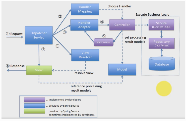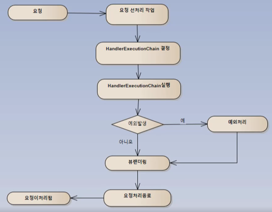 Spring MVC 3: 구성요소2 { DispatcherServlet 동작 흐름, 요청 선처리작업, 요청전달, 요청처리, 예외처리, 뷰렌더링, 요청처리종료 }
