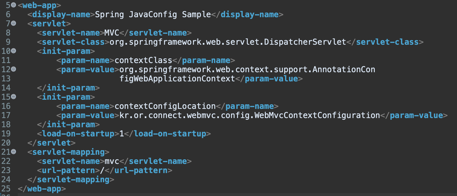 그 다음 설정인데요. Java Config spring 설정을 읽어들이도록 DispatcherServlet 설정을 해주고 있습니다. 위의 설정에서 두번째 param-value 부분을 보면 이전에 넣었던 xml 파일 대신에 java 클래스가 들어가 있는 것을 볼 수 있는데요. xml 파일이 아니라 java config 파일을 읽어오고 있구나라고 이해할 수 있습니다. 수업에서는 이 방법을 이용해서 설정들을 읽어오도록 할 겁니다. 이때 잘 보면 Servlet 이었을 경우에 요청이 들어오면 servlet-mapping 태그 안에 우리가 원하는 url 을 넣고 servlet name 과 같은 실제 servlet 을 위에서 servlet 태그 안에서 찾아서 실행한다라고 이해하시면 됩니다. 그런데, 여기서 <url-pattern> 태그에 '/' 슬러시가 입력되어 있는 것을 확인할 수 있는데요. 이 슬러시 덕분에 특정 하나의 요청만 받아들이는 것이 아니라 모든 요청을 받게 됩니다. 모든 요청을 DispatcherServlet 이 받도록 설정하는 것은 이렇게 간단하게 설정 가능했습니다.