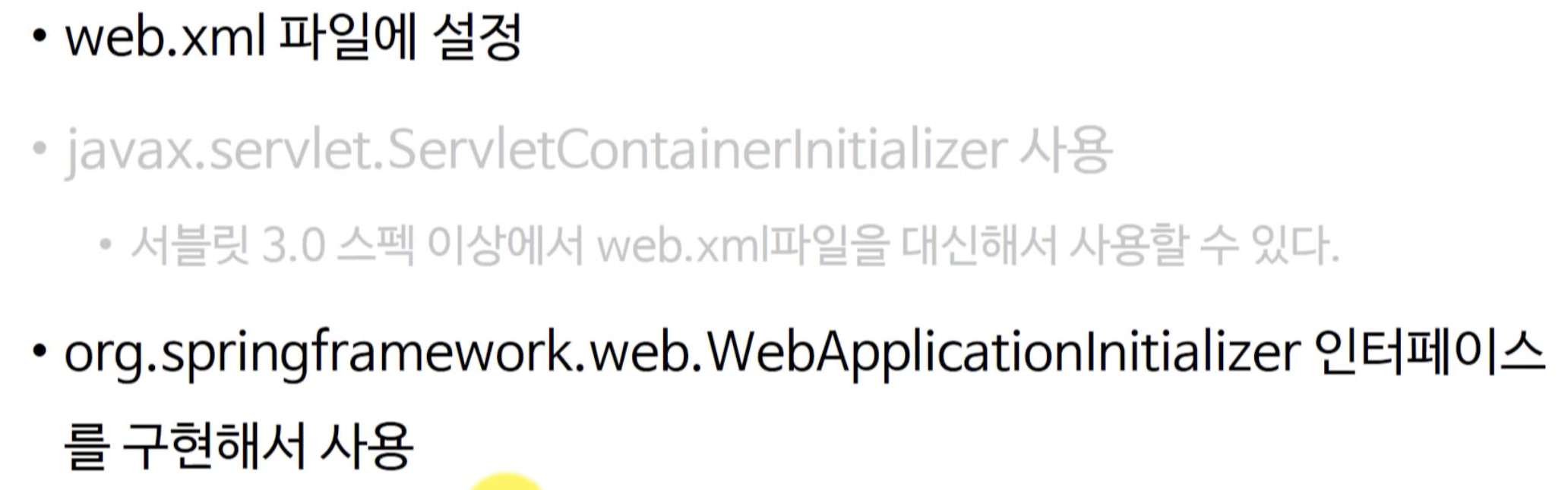 =================== [ WebApplicationInitializer 활용하여 설정하기] ====================== Spring 이 제공하는 WebApplicationInitializer 를 활용할 수도 있다고 했었는데요. 이 방법의 단점은 애플리케이션 실행이 오래 걸릴 수도 있다는 점입니다. Spring MVC는 WebApplicationInitializer 구현체를 찾고 그 속에 있는 onStartup 을 활용하는데요. 구동 시간이 오래 걸린다는 단점이 있습니다.