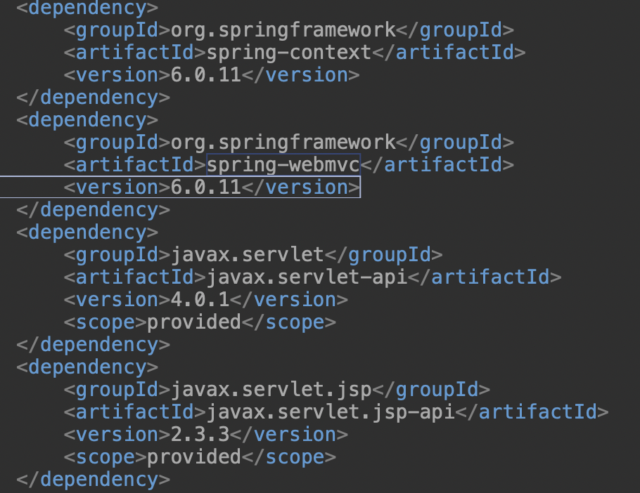메이븐 프로젝트를 생성한 다음에는 라이브러리를 pom.xml 에 추가해주어야 합니다. spring-context, spring-webmvc, servlet-api, jsp-api 를 추가해주었습니다.