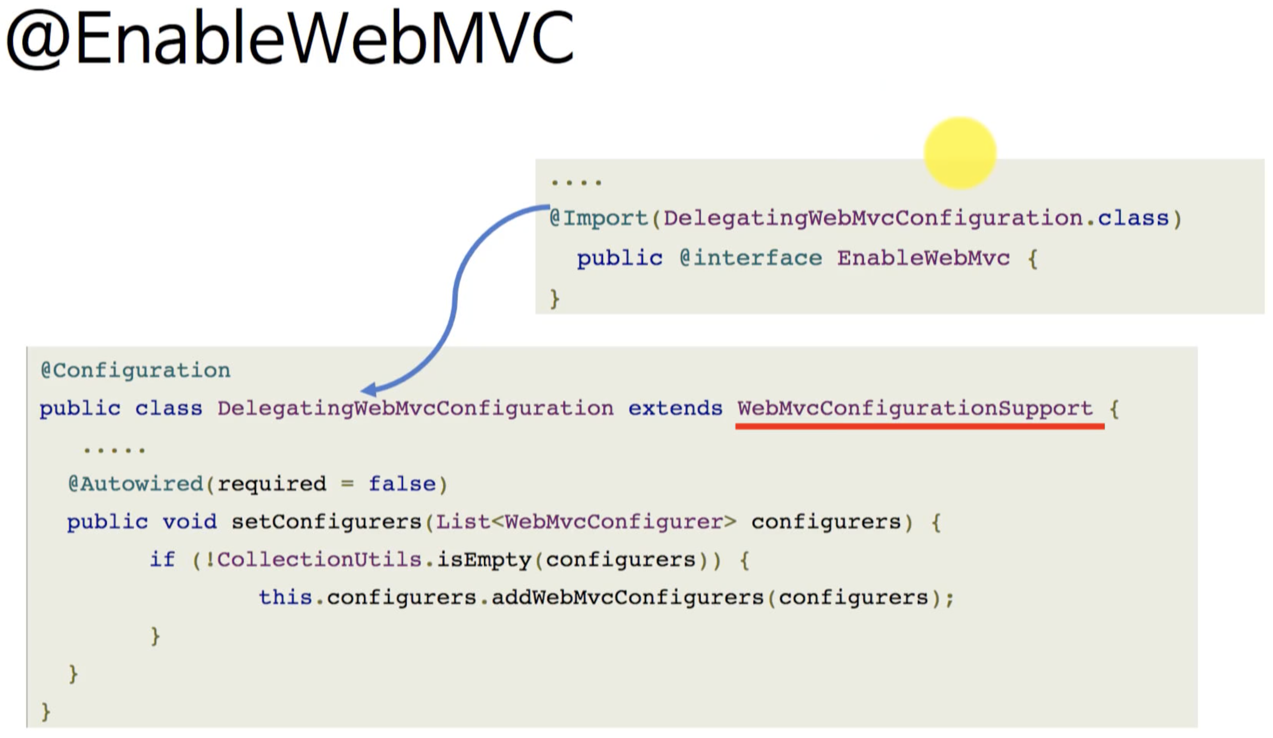 -) @EnableWebMvc : @EnableWebMvc 애노테이션은 DispatcherServlet 의 RequestMappingHandlerMapping, RequestMappingHandlerAdapter, ExceptionHandlerExceptionResolver, MessageConverter 등 Web 에 필요한 빈들을 대부분 자동으로 설정 해준다. 기본 설정 이외의 설정이 필요하다면 WebMvcConfigurerAdapter 를 상속받도록 Java config class 를 작성한 후, 필요한 메소드를 오버라이딩 하도록 한다. 소스코드를 직접 살펴보면 좀 더 자세히 살펴볼 수 있는데요. EnableWebMvc 인터페이스를 상속받고 있는 것을 확인할 수 있습니다.