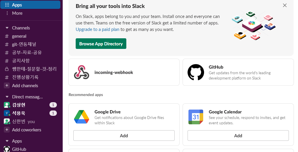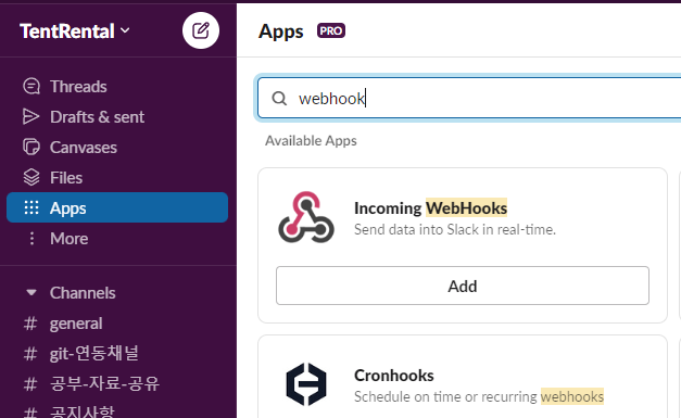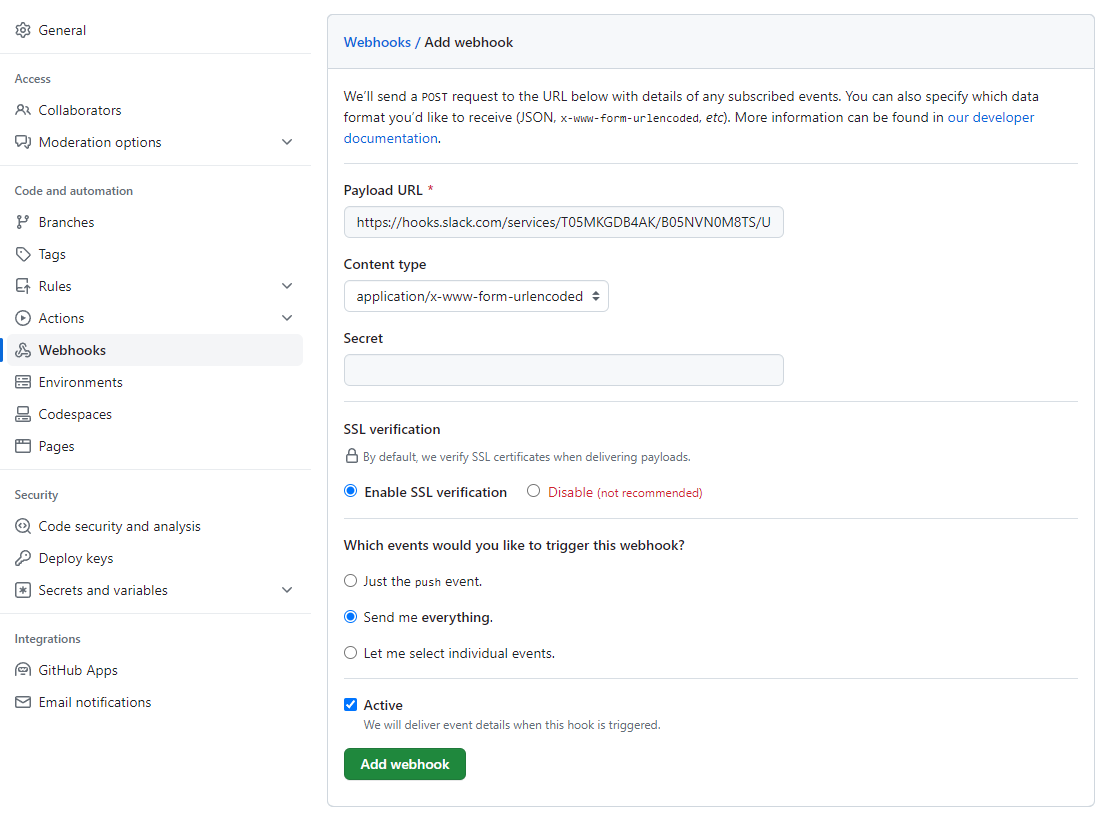 슬랙에서 채널을 선택한 다음 Apps 에서 webhook 을 검색한후 Add 한다. add to Slack 클릭 연동할 slack 채널을 선택한 다음 add 클릭합니다. Webhook URL 을 복사합니다. 깃허브 저장소 - settings - webhooks 에서 Add webhook 을 클릭합니다. URL에 복사한 것을 붙여넣고, Which events would you like to trigger this webhook 에서 git 관련 이벤트들 중에서 어떤 것이 발생할 때 알람을 받을지 설정을 합니다. 우선 everything 으로 설정하고 add 합니다.