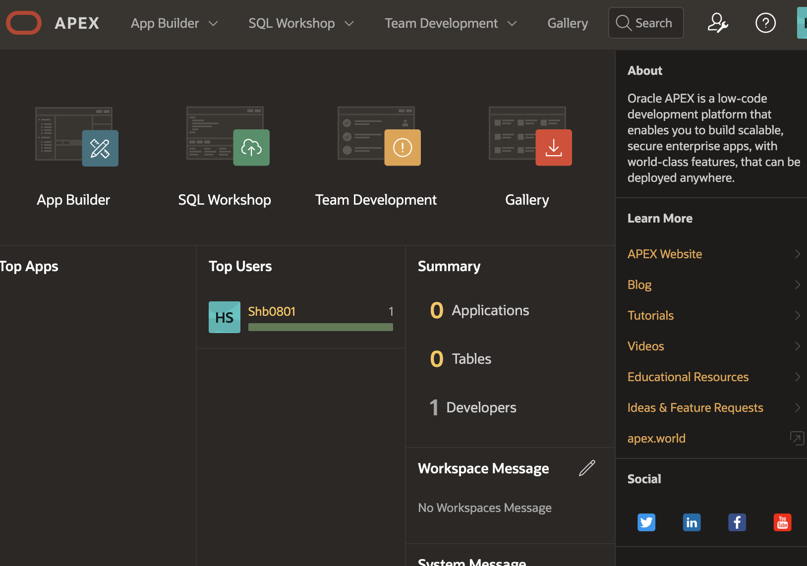 오라클을 인터넷에서 손쉽게 접근할 수 있는 것이 Apex 인데,start for free today 를 클릭해서 진행하자. free apex workspace 클릭 회원가입 진행, 여기서 주의할 점은 WorkSpace 이름을 자신만의 unique 로 설정해서 진행해야하고, 잊어버리면 안되니까 어디에 적어주자. 요청을 완료하면 입력한 이메일 주소로 메일이 날아오게 된다. 이런 이메일이 3분 이내로 도착하게 된다. 비밀번호를 설정해준다. 나만의 workspace 생성 완료다. SQL Workspace 를 클릭하면 위와 같이 SQL Commands 메뉴가 나온다. 이 화면에서 SQL 을 테스트할 수 있다.