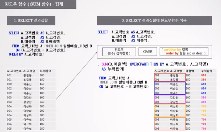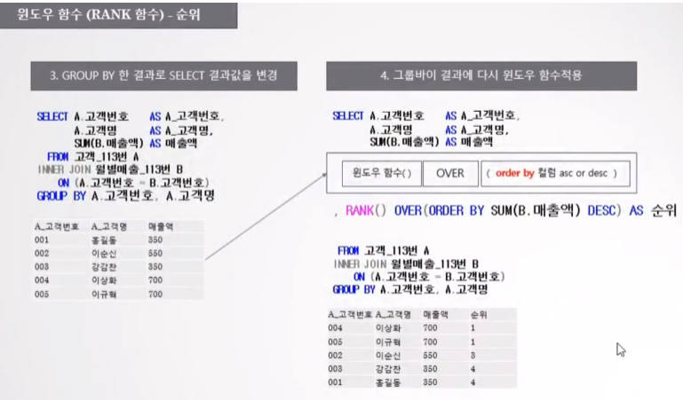 Group By 한 결과에 윈도우 함수를 적용하는 것을 볼 수 있다. 윈도우 함수 내부에서 Partition By 로 이전의 Group By 와 동일한 효과를 누리고 있다.