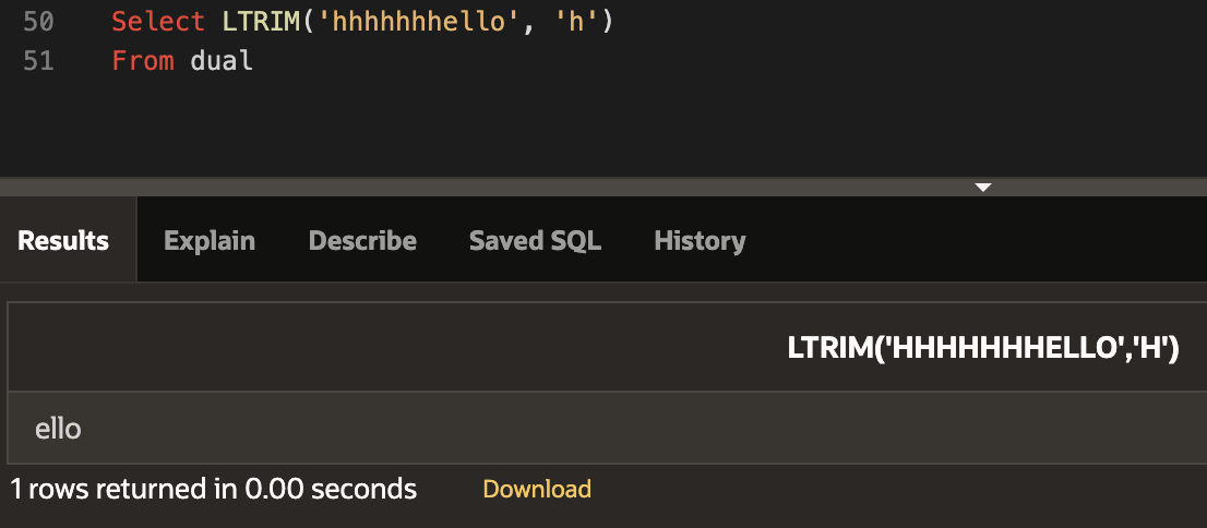 그 다음으로 보게 될 함수는 TRIM 함수인데요. LTRIM 과 RTRIM이 있습니다. TRIM 함수는 좌 혹은 우에서 내가 지정한 문자열 혹은 공백을 지워주는 함수입니다. 여기서 재밌는 점은 세 번째 SQL 인데요. TRIM 대상에 해당하는 문자열이 왼쪽 시작부터 나열된 것이 아니라면 지워지지는 않는 다는 점입니다.