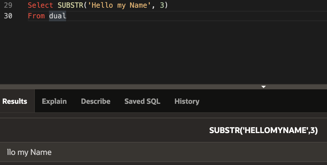 SUBSTR( ) 함수는 3개의 인자를 갖는데요. 첫 번째 인자는 문자열 혹은 컬럼이 들어가고, 두 번째 인자는 시작 위치, 세 번째 인자는 짤라낼 개수를 의미합니다. 여기서 주의할 점은 첫 번째 문자가 0이 아니고 1입니다. 여기서 또 재밌는 점은 세 번째 인자를 생략하는 경우인데요. 3번 째 인자를 생략하게 되면 위의 예제처럼 두 번째 인자 위치에서부터 끝까지 모든 문자가 출력되게 됩니다.