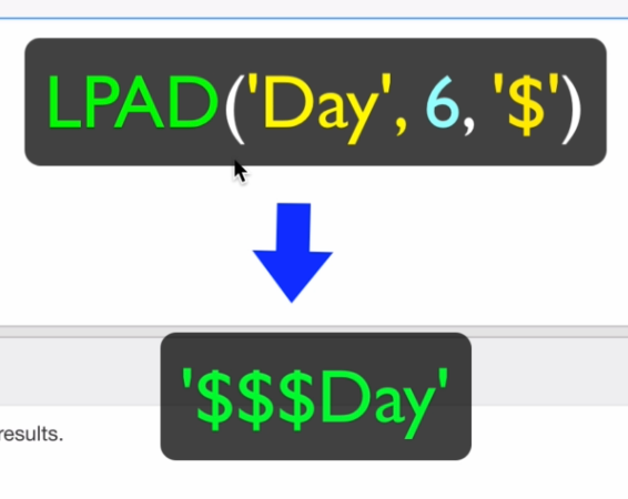 다음으로 볼 함수는 LPAD 함수입니다. LPAD 함수도 마찬가지로 3개의 인자를 갖는데요. 첫 번째 인자로는 문자열 혹은 속성이 오고, 두 번째 인자로는 자리 수 가 옵니다. 세 번째는 자리수 중에 남은 자리에 채울 문자열을 입력하게 됩니다. LPAD 는 Left 위치에 남는 자리에 문자열을 채우는 함수가 됩니다. Third argument is the string that we want to pad on the left side.