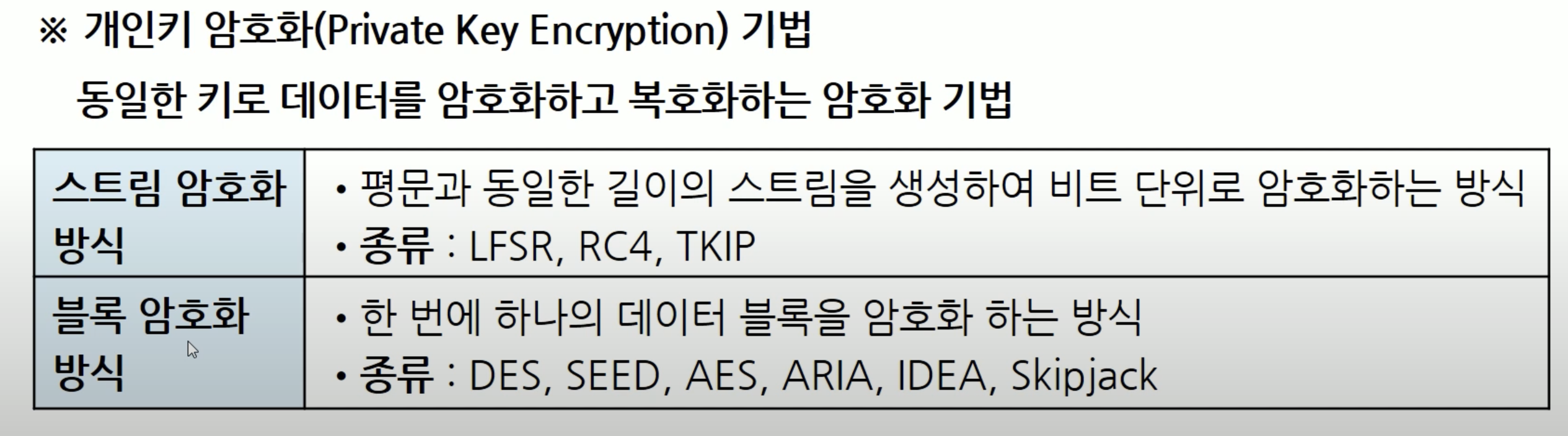 스트림 암호화 방식과 블록 암호화 방식으로 2가지가 있습니다.